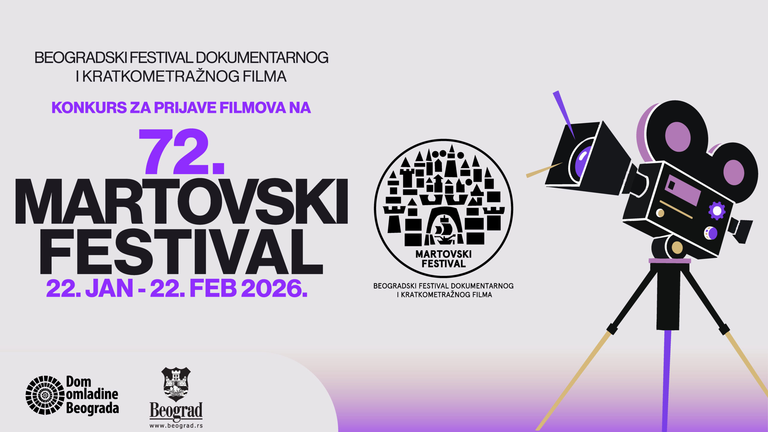 Odbor Festivala i Dom omladine Beograda obaveštavaju sve domaće produkcije i autore da je od 22. januara 2026. do 22. februara 2026. godine rok za podnošenje prijava za selekciju domaćeg takmičarskog programa (dokumentarnog do 50 minuta, dokumentarnog preko 50 minuta, kratkog igranog, animiranog, eksperimentalnog filma i video arta) 72. BEOGRADSKOG FESTIVALA DOKUMENTARNOG I KRATKOMETRAŽNOG FILMA – MARTOVSKOG FESTIVALA.