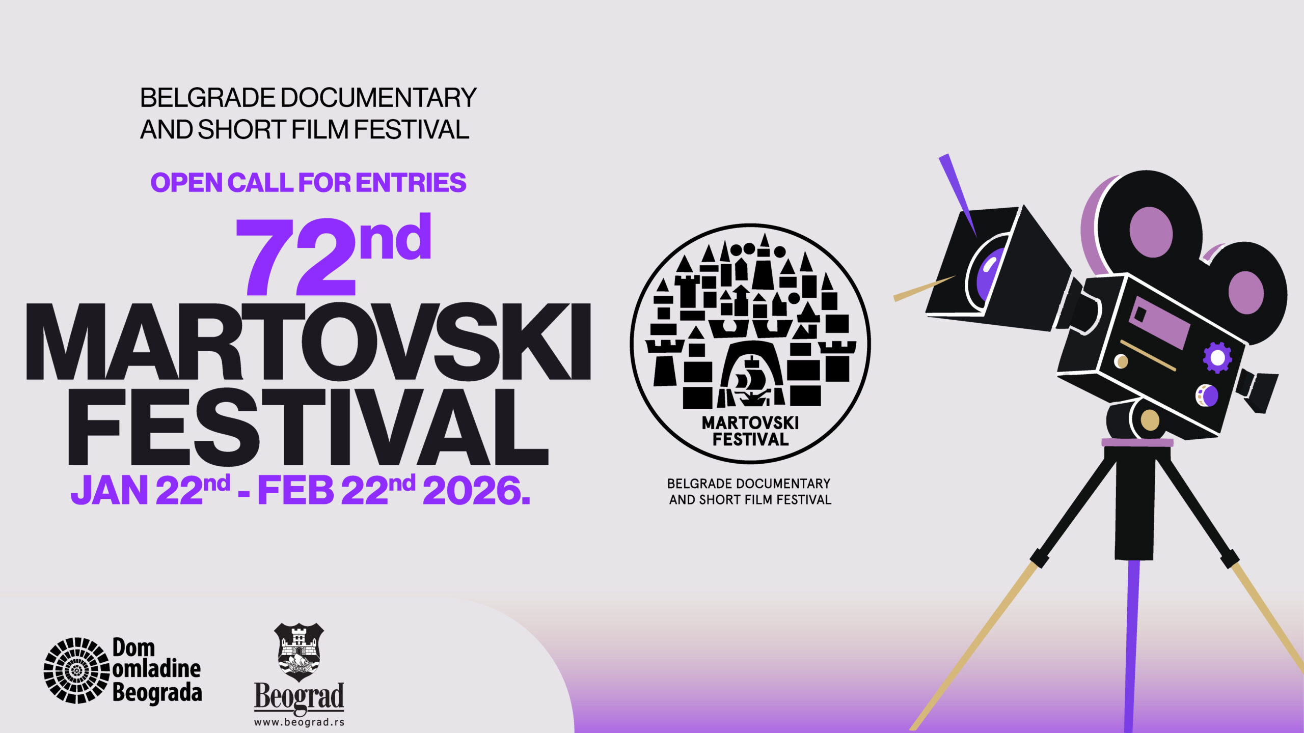 The Festival Board and the Belgrade Youth Centre hereby inform all producers and filmmakers from Serbia that they can enter their submissions starting from January 22 to February 22, 2026, at the latest, for the Domestic Competition Program (documentary film with running time up to 50 minutes, documentary film with running time over 50 minutes, short film, animated film, experimental film and video art) of THE BELGRADE DOCUMENTARY AND SHORT FILM FESTIVAL – MARTOVSKI FESTIVAL, 72nd EDITION.